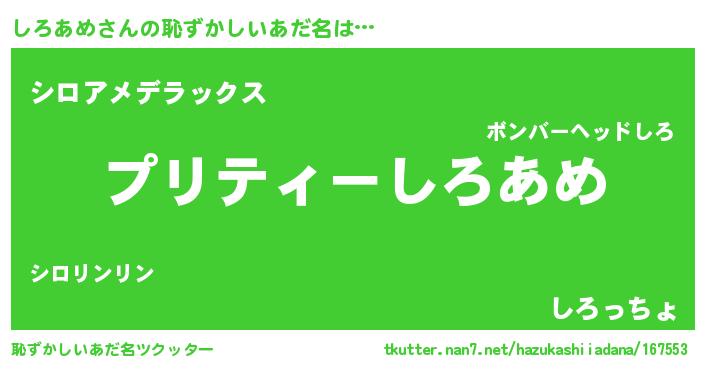 | 意味不明あだ名 | 『ペロリンしろあめ』『自称しろあめ』 |