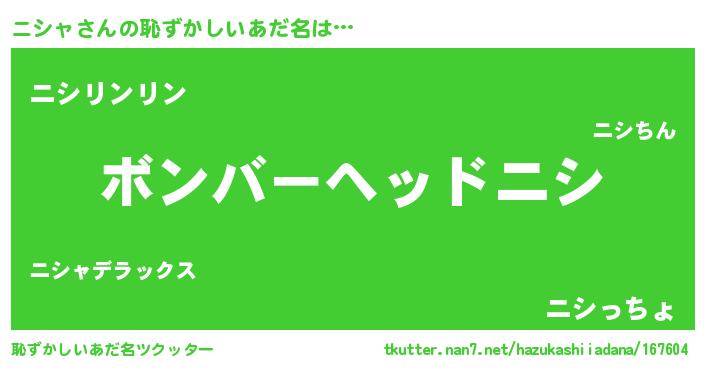 | ヒーロー風カッコイイあだ名 | 『天空の使者ニシャ』『銀牙騎士ニシ』 |