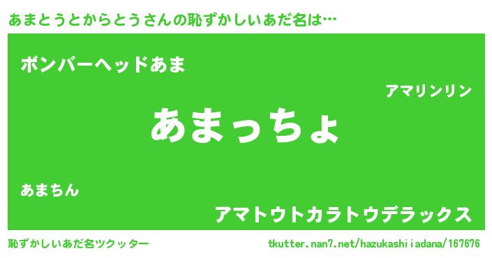 | 意味不明あだ名 | 『住所不定無職あまとうとからとう(86歳)』 |