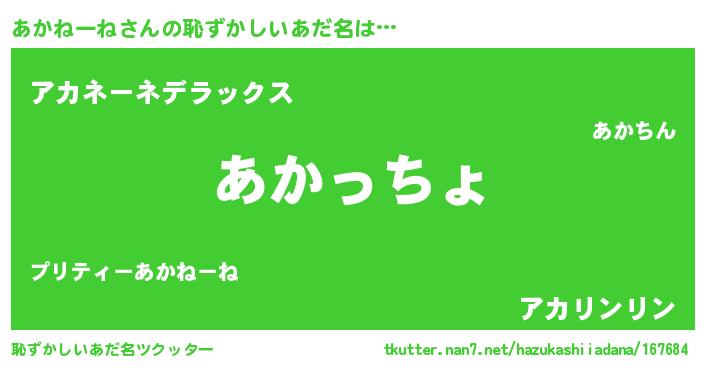 | 男性向けラノベタイトル風あだ名 | 『アカネーネスレイヤー』 |