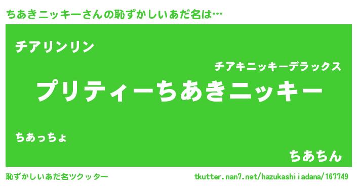 | 男性向けラノベタイトル風あだ名 | 『ちあきニッキー~年齢イコール彼女いない歴の魔法使い~』 |