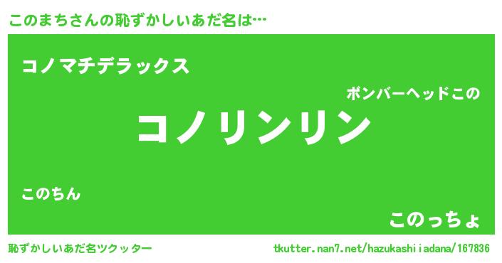 | 男性向けラノベタイトル風あだ名 | 『このまちの嫁は女の子じゃないと思った?』 |