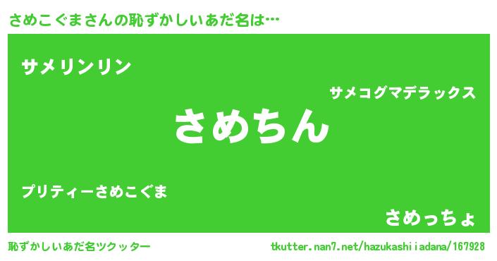 | ヘコむあだ名 | 『さめこぐま(遠い目)』『さめお』 |