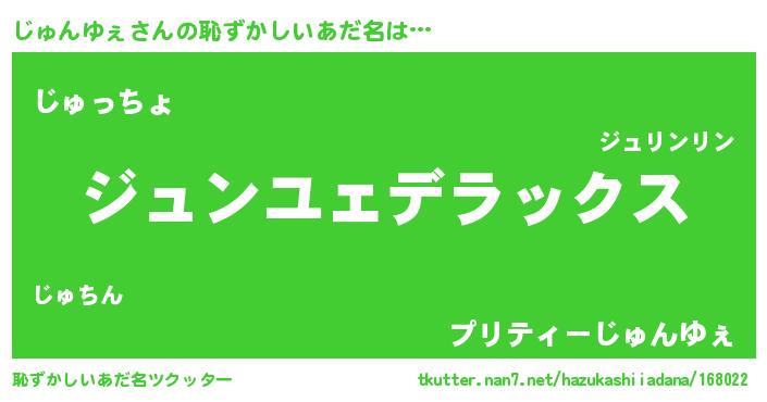 | 男性向けラノベタイトル風あだ名 | 『Re:じゅんゆぇから始める異世界生活』 |
