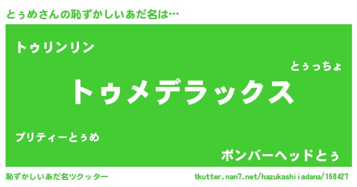 | 意味不明あだ名 | 『自称とぅめ』『住所不定無職とぅめ(56歳)』 |