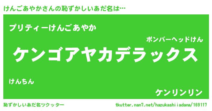 けんごあやかさんの恥ずかしいあだ名は… 『ケンゴアヤカデラックス』『プリティーけんごあやか』『ケンリンリン』 ツクッター #恥ずかしいあだ名ツクッター http://tkutter.nan7.net/hazukashiiadana/169117/