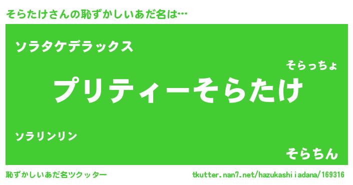 | 意味不明あだ名 | 『ペロリンそらたけ』『自称そらたけ』 |