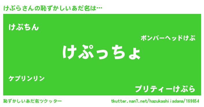 けぷらさんの恥ずかしいあだ名は… 『けぷっちょ』『けぷちん』『プリティーけぷら』 ツクッター #恥ずかしいあだ名ツクッター http://tkutter.nan7.net/hazukashiiadana/169654/