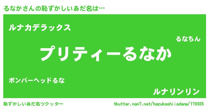 | ヘコむあだ名 | 『るなふぇ~』『るなを』『なまこ酢』 |
