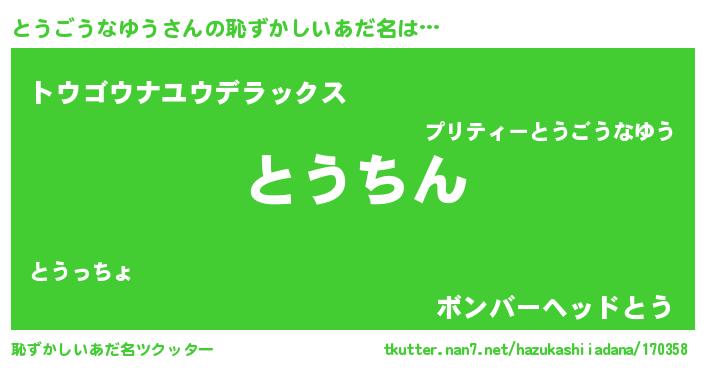 | 男性向けラノベタイトル風あだ名 | 『とうごうなゆうという概念が存在しない退屈な世界 』 |