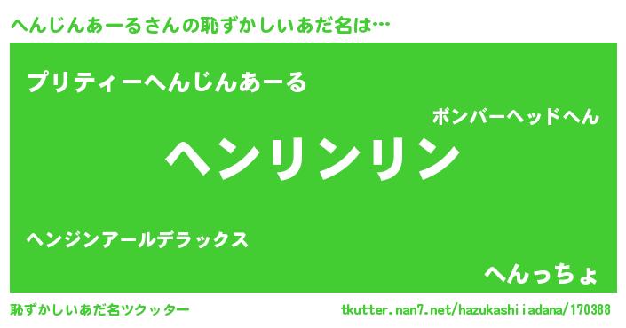 | 男性向けラノベタイトル風あだ名 | 『へんじんあーるの嫁は女の子じゃないと思った?』 |