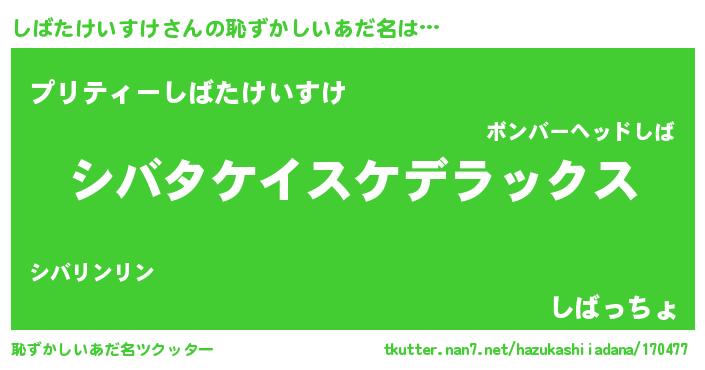 | 男性向けラノベタイトル風あだ名 | 『しばたけいすけ~年齢イコール彼女いない歴の魔法使い~』 |