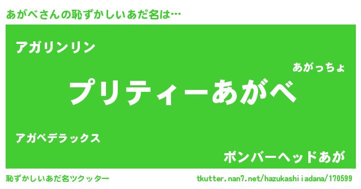 | 意味不明あだ名 | 『ペロリンあがべ』『なめこ科あがべ属』 |