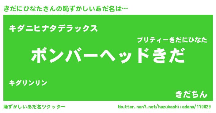 きだにひなたさんの恥ずかしいあだ名は… 『ボンバーヘッドきだ』『キダニヒナタデラックス』『きだちん』 ツクッター #恥ずかしいあだ名ツクッター http://tkutter.nan7.net/hazukashiiadana/170829/