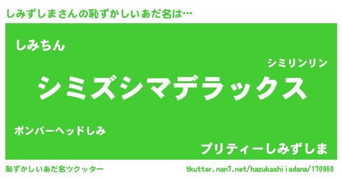 | 女子向けラノベタイトル風あだ名 | 『しみずしまなんてお断りですっ。』 |