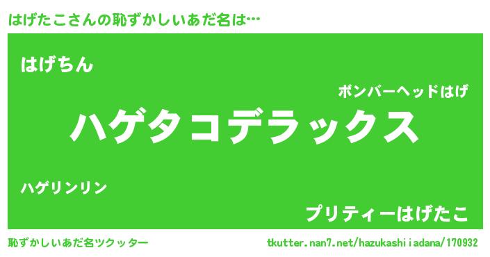| 意味不明あだ名 | 『自称はげたこ』『永久保存はげたこ』 |