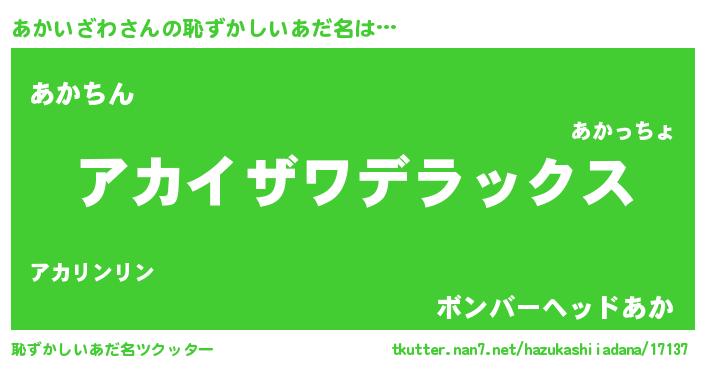 | 男性向けラノベタイトル風あだ名 | 『Re:あかいざわから始める異世界生活』 |