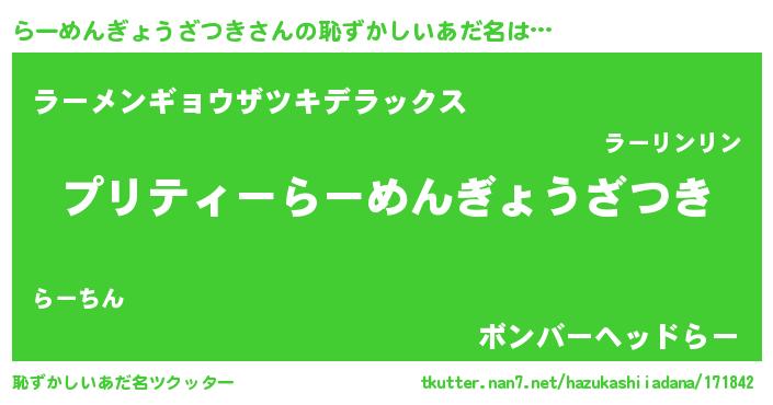 | 意味不明あだ名 | 『住所不定無職らーめんぎょうざつき(77歳)』 |