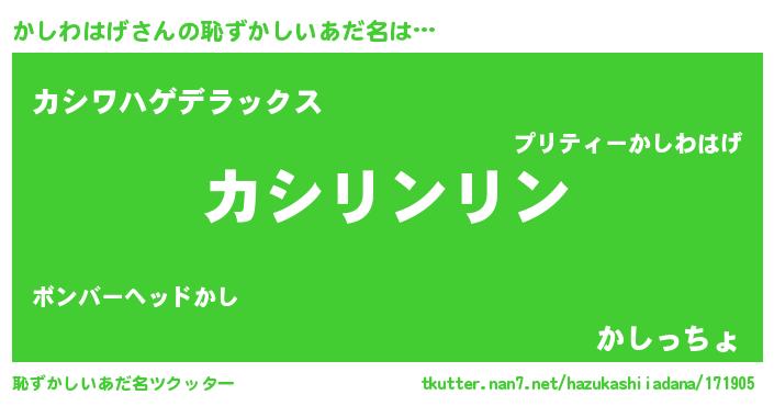 | 男性向けラノベタイトル風あだ名 | 『かしわはげ~年齢イコール彼女いない歴の魔法使い~』 |