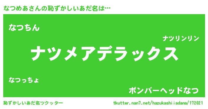 | 男性向けラノベタイトル風あだ名 | 『この素晴らしい世界になつめあを!』 |