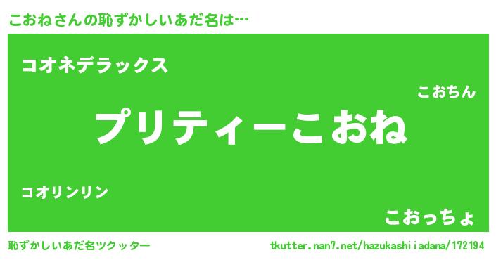 | 意味不明あだ名 | 『めかぶ科こおね属』『ペロリンこおね』 |