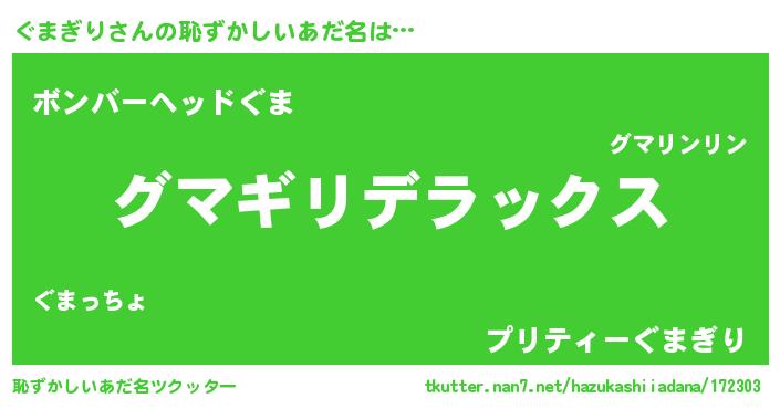 | ヒーロー風カッコイイあだ名 | 『仮面グマダー』『サイバー戦士グマギリ』 |