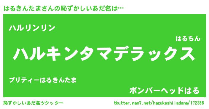 | 男性向けラノベタイトル風あだ名 | 『はるきんたま~年齢イコール彼女いない歴の魔法使い~』 |