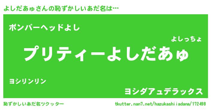 | 意味不明あだ名 | 『ペロリンよしだあゅ』『自称よしだあゅ』 |