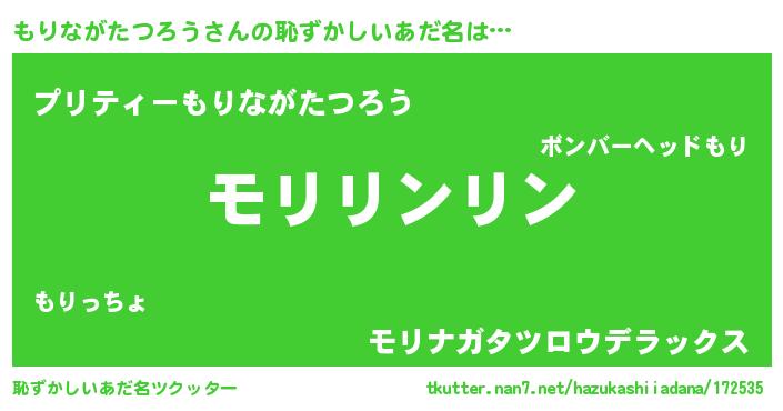 | 男性向けラノベタイトル風あだ名 | 『転生したらもりながたつろうだった件』 |