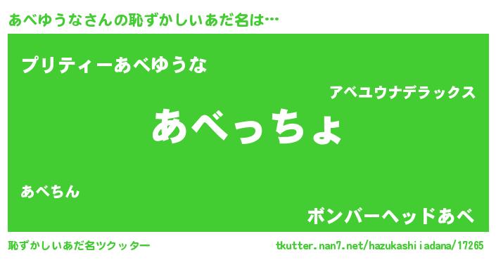 | 男性向けラノベタイトル風あだ名 | 『あべゆうな~年齢イコール彼女いない歴の魔法使い~』 |