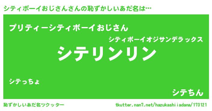 | 男性向けラノベタイトル風あだ名 | 『シティボーイおじさんの嫁は女の子じゃないと思った?』 |