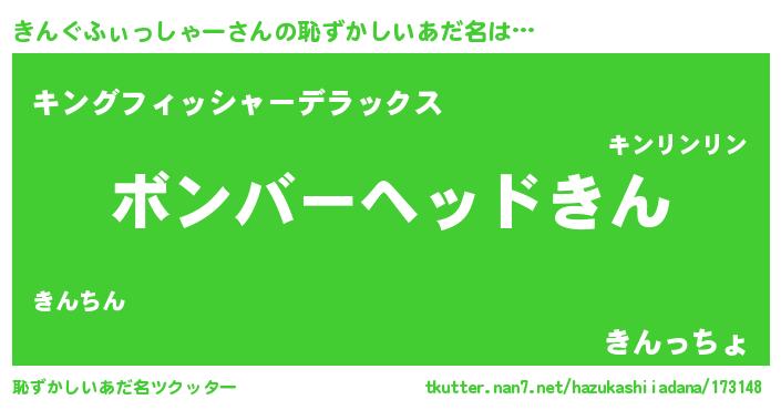 | 男性向けラノベタイトル風あだ名 | 『うちのきんぐふぃっしゃーが世界を掌握している!』 |