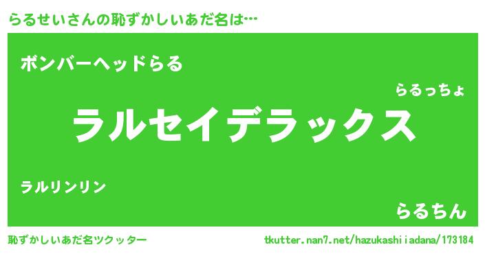 | ヘコむあだ名 | 『らるせい(小並感)』『酢こんぶ』 |