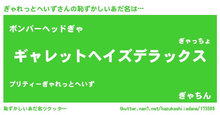 | 男性向けラノベタイトル風あだ名 | 『この素晴らしい世界にぎゃれっとへいずを!』 |