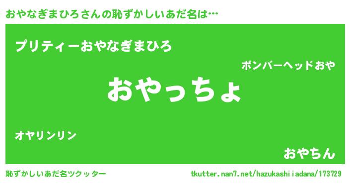 | 男性向けラノベタイトル風あだ名 | 『おやなぎまひろ~年齢イコール彼女いない歴の魔法使い~』 |