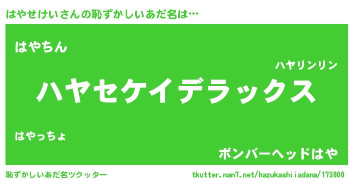 | 意味不明あだ名 | 『自称はやせけい』『永久保存はやせけい』 |