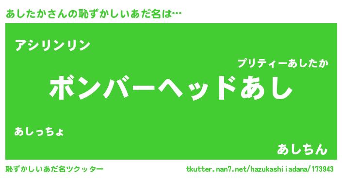 | 男性向けラノベタイトル風あだ名 | 『緋弾のアシタカ』『魔弾の王とあしたか』 |