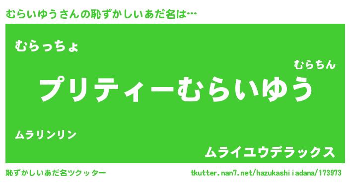 | 男性向けラノベタイトル風あだ名 | 『この素晴らしい世界にむらいゆうを!』 |
