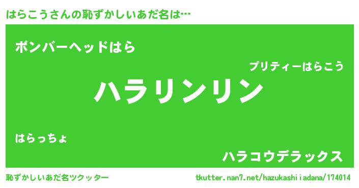 | 男性向けラノベタイトル風あだ名 | 『はらこうの嫁は女の子じゃないと思った?』 |