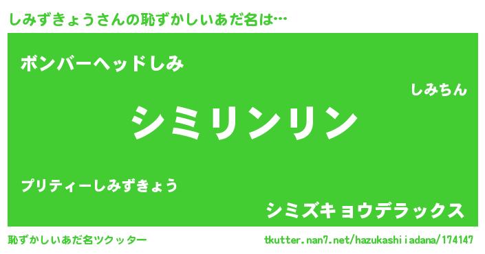 | 男性向けラノベタイトル風あだ名 | 『しみずきょうの嫁は女の子じゃないと思った?』 |