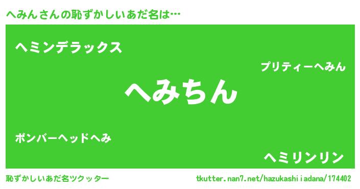 | 意味不明あだ名 | 『永久保存へみん』『自称へみん』 |
