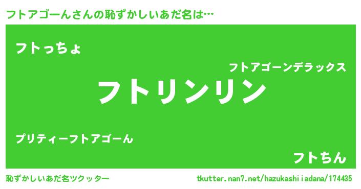 | 男性向けラノベタイトル風あだ名 | 『ダンジョンにフトアゴーんを求めるのは間違っているだろうか』 |
