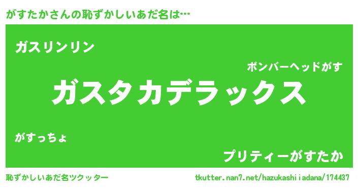 | 男性向けラノベタイトル風あだ名 | 『Re:がすたかから始める異世界生活』 |