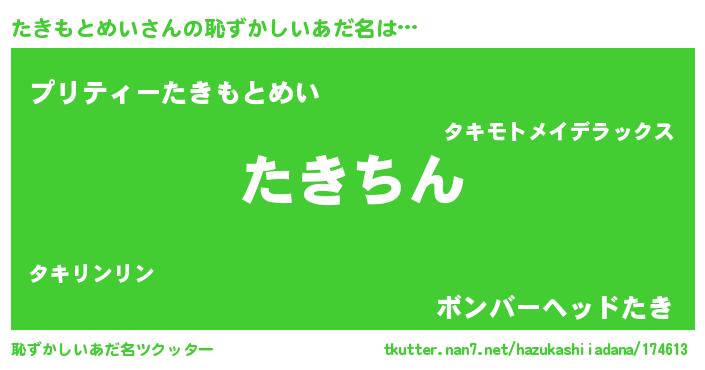 | ヘコむあだ名 | 『たきもとめい(笑)』『たきっふぃ~』 |