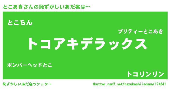 | 意味不明あだ名 | 『自称とこあき』『永久保存とこあき』 |