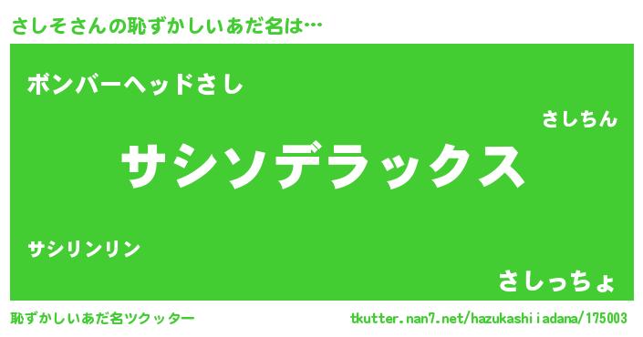 | 男性向けラノベタイトル風あだ名 | 『Re:さしそから始める異世界生活』 |