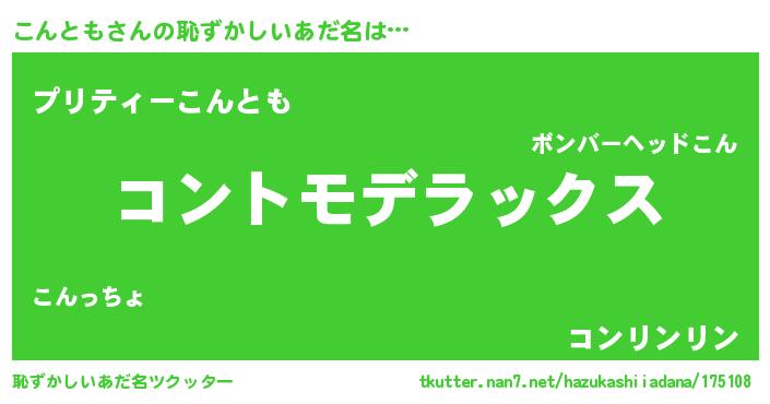 | 男性向けラノベタイトル風あだ名 | 『Re:こんともから始める異世界生活』 |