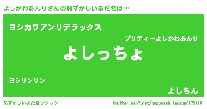 | ヘコむあだ名 | 『酢こんぶ』『よしかわあんり(苦笑)』 |
