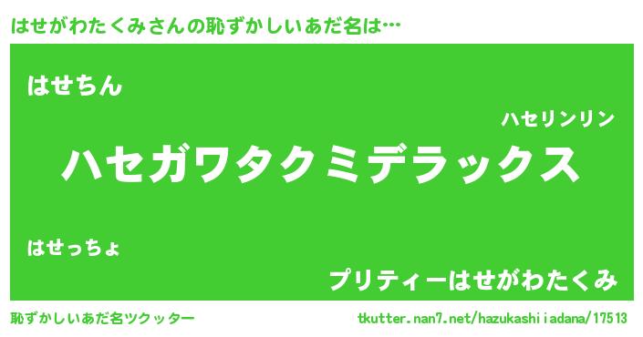 | ヘコむあだ名 | 『はせがわたくみ(笑)』『はせにゅー』 |