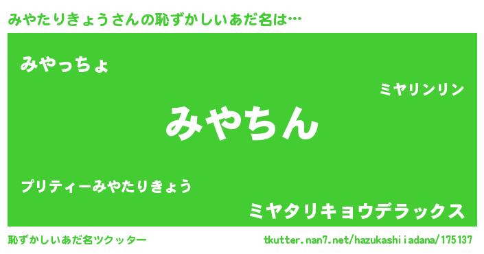 | ヘコむあだ名 | 『みやたりきょう(笑)』『なまこ酢』 |